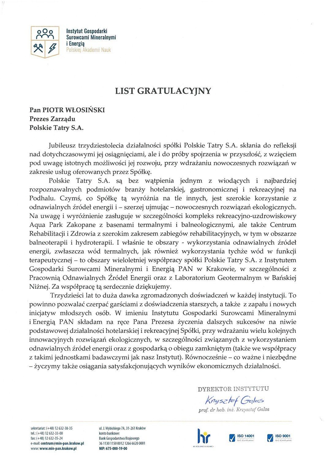 Jubileusz zainaugurował Prezes Spółki - Piotr Włosiński, który przedstawił zebranym prezentację multimedialną "Powrót do źródeł", będącą podsumowaniem dotychczasowej działalności Spółki oraz poinformował o planach na przyszłość. Wspomniał m.in. o mentalnym i fizycznym powrocie do źródeł, którego efektem jest rebranding jednej z jednostek zarządzanych przez Spółkę. Aqua Park Zakopane to teraz Termy Zakopiańskie.