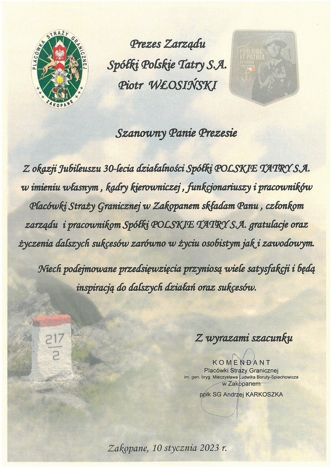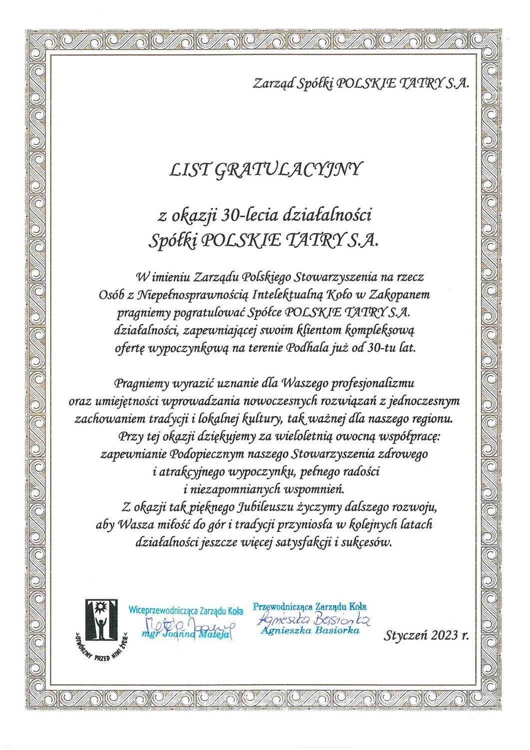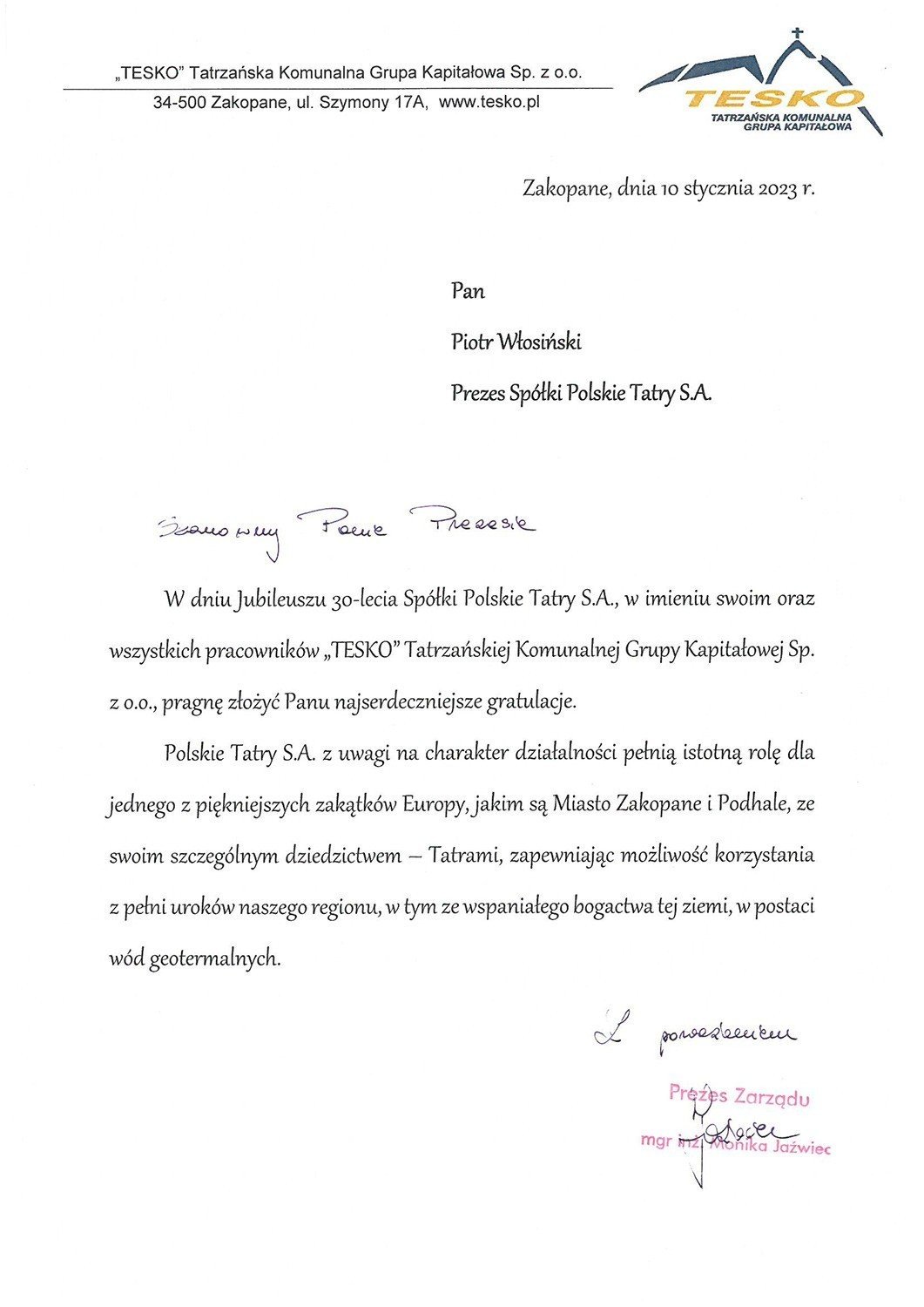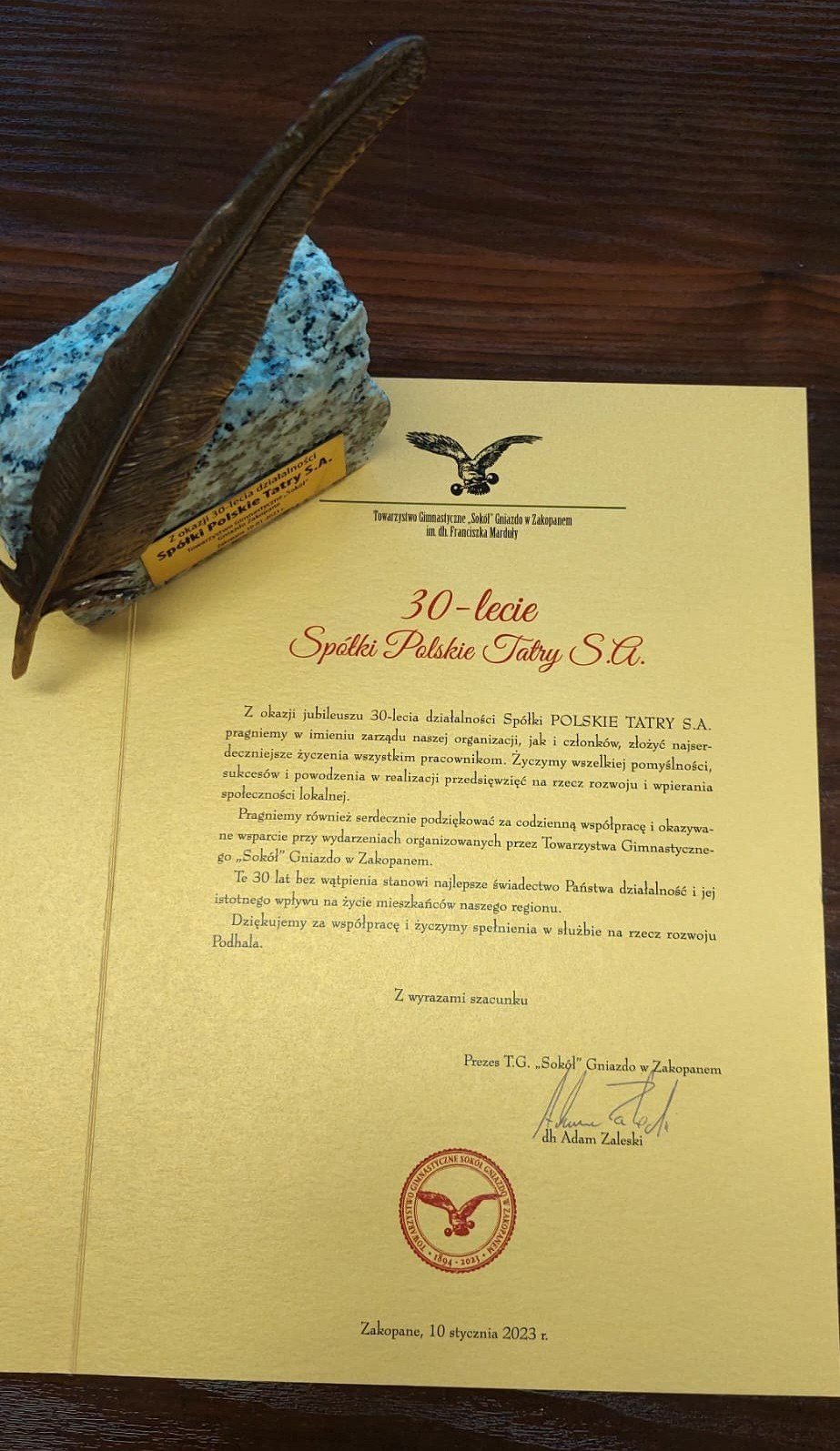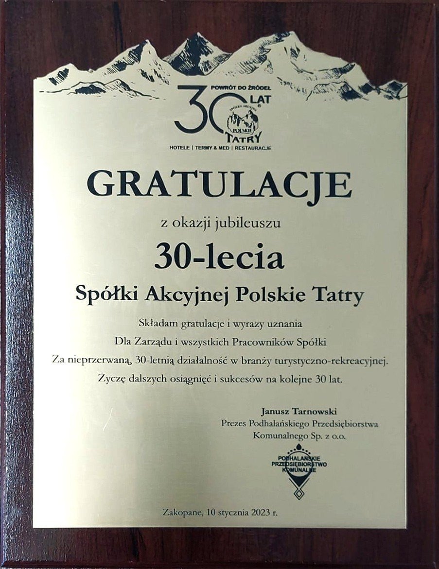 Dnia 10.01.2023r. Spółka POLSKIE TATRY S.A. świętowała w Kompleksie Antałówka TERMY & MED swój okrągły jubileusz. Na obchody trzydziestolecia zaproszone zostały osoby, które w jej funkcjonowaniu odgrywały i odgrywają nadal zasadniczą rolę. Wśród gości znaleźli się też reprezentanci świata kultury, nauki, polityki oraz dziennikarze.